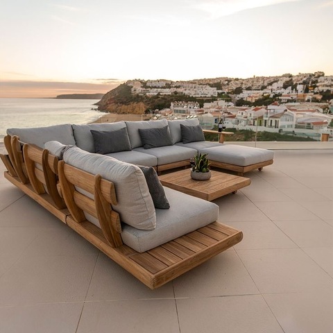 خشب الساج عالي الجودة على شكل حرف L ، أثاث حدائق فاخر للفنادق والفيلات لغرفة المعيشة ، أريكة خارجية من الخشب الصلب للفناء